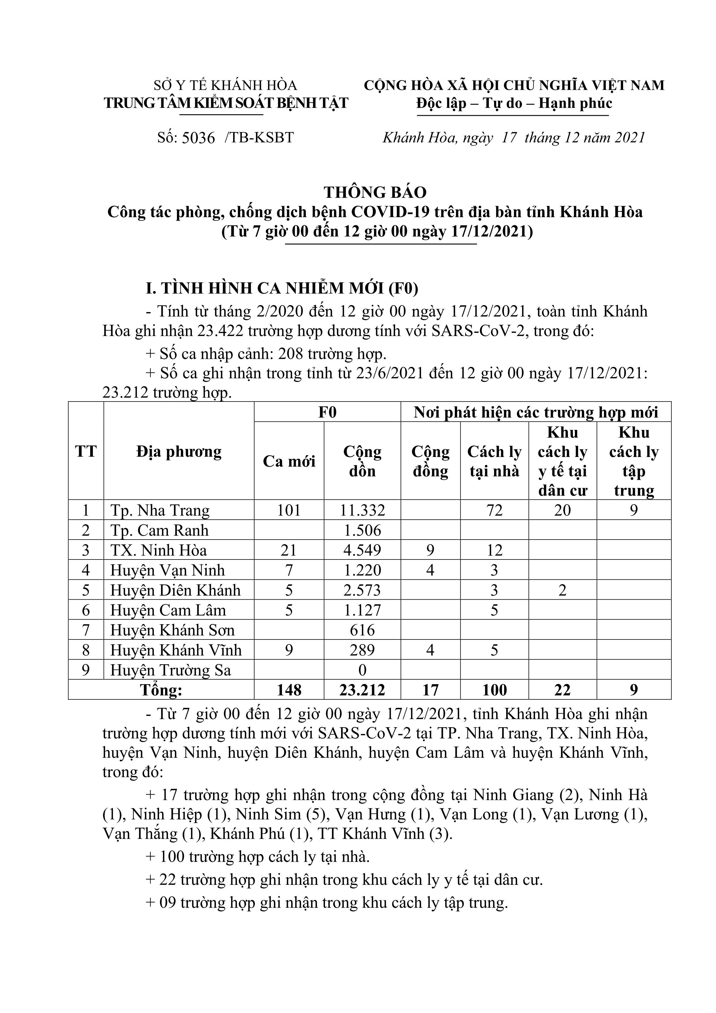 Trưa 17-12, theo Trung tâm Kiểm soát bệnh tật tỉnh Khánh Hòa, từ 7 giờ đến 12 giờ cùng ngày, toàn tỉnh ghi nhận thêm 148 ca dương tính với SARS-CoV-2.