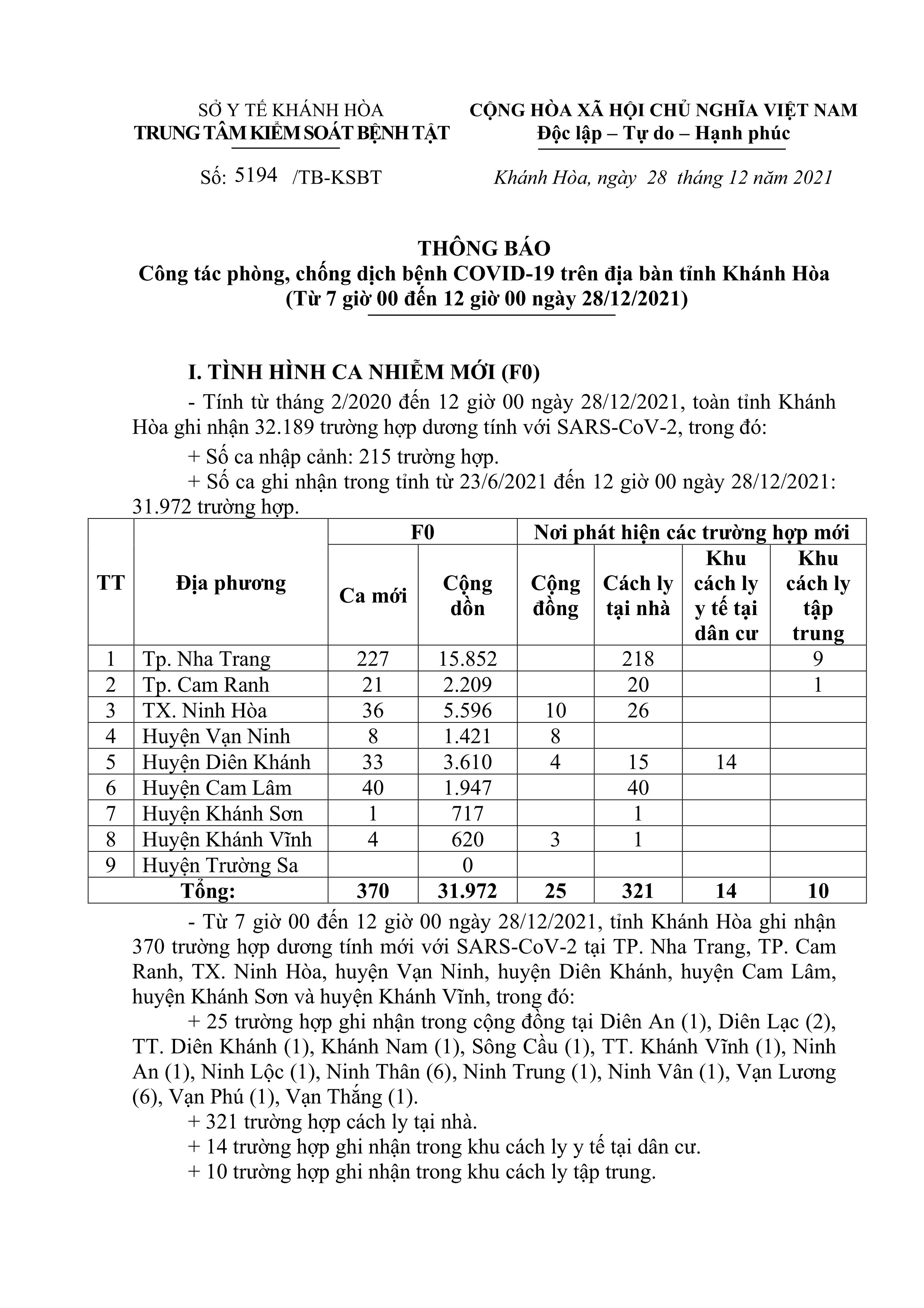 Trưa 28-12, theo Trung tâm Kiểm soát bệnh tật tỉnh Khánh Hòa, từ 7 giờ đến 12 giờ cùng ngày, toàn tỉnh ghi nhận thêm 370 ca dương tính với SARS-CoV-2.