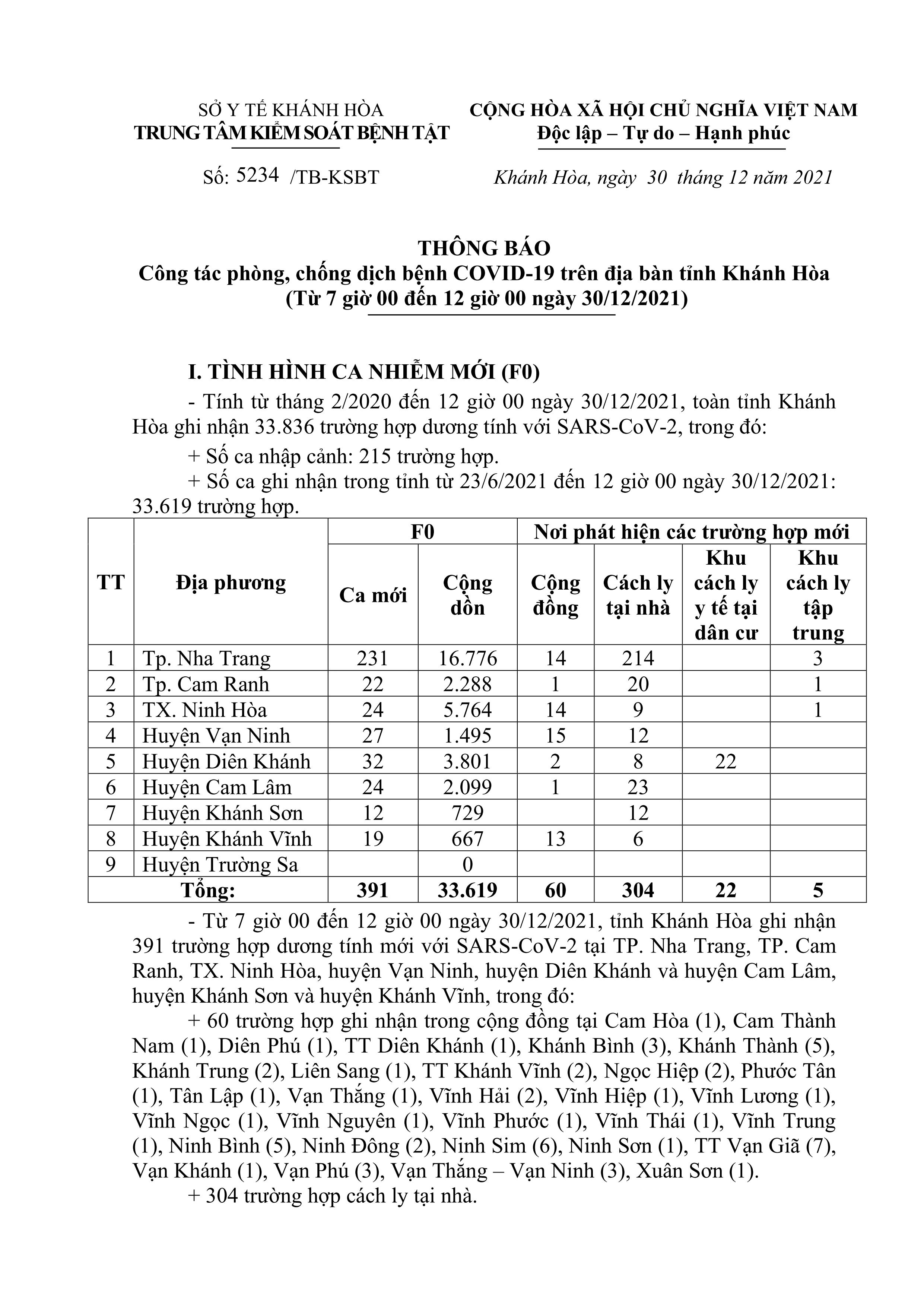Trưa 30-12, theo Trung tâm Kiểm soát bệnh tật tỉnh Khánh Hòa, từ 7 giờ đến 12 giờ cùng ngày, toàn tỉnh ghi nhận thêm 391 ca dương tính với SARS-CoV-2.
