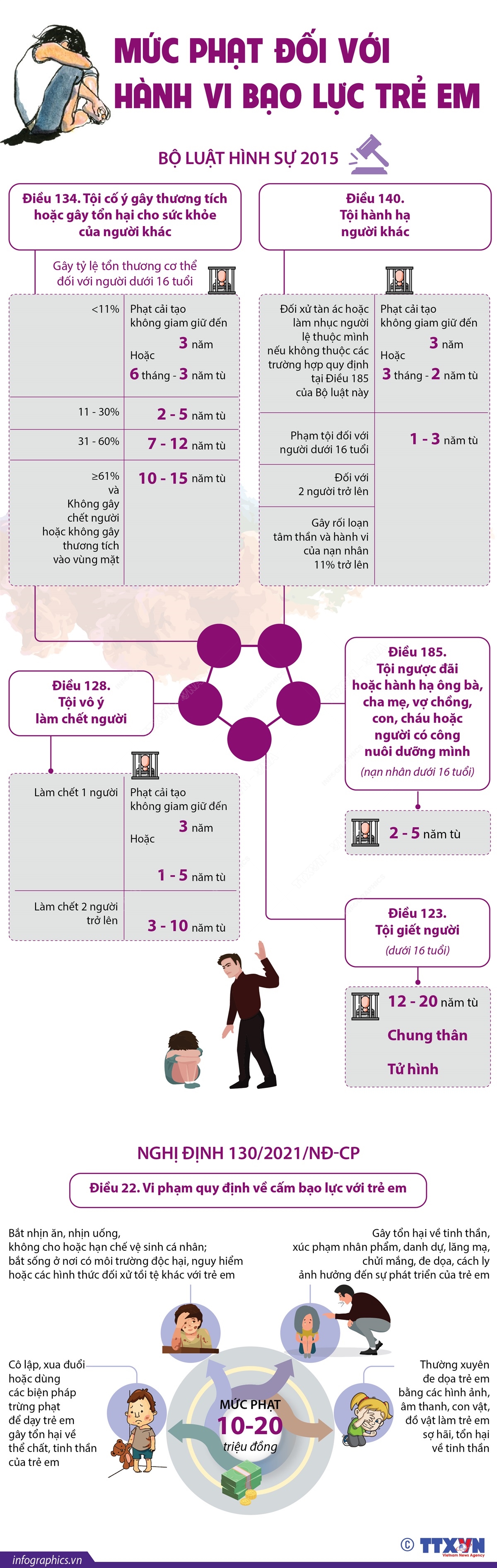 Theo quy định pháp luật hiện hành, người có hành vi bạo lực trẻ em có thể đối diện với hình phạt cao nhất là tử hình. Nếu chưa đến mức truy cứu trách nhiệm hình sự thì cũng bị phạt hành chính từ 10-20 triệu đồng.