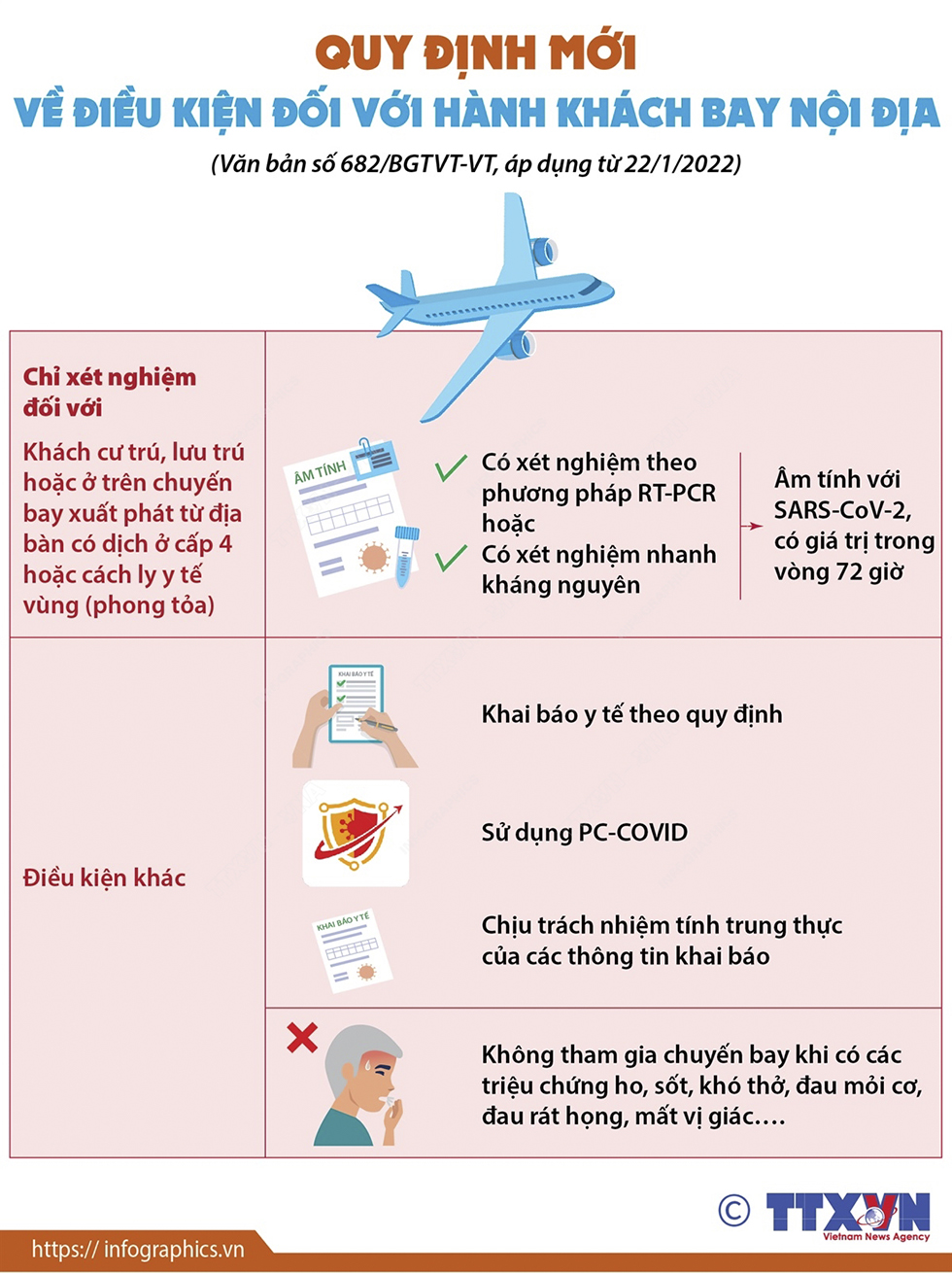 Bộ Giao thông vận tải đã có văn bản số 682/BGTVT-VT điều chỉnh tiêu chuẩn, điều kiện đối với khách bay nội địa. Theo đó, từ 22/1/2022, chỉ những hành khách cư trú, lưu trú trước chuyến bay hoặc xuất phát từ cảng hàng không tại địa bàn có dịch ở cấp 4 hoặc cách ly y tế vùng (phong tỏa) mới phải có kết quả xét nghiệm âm tính với SARS-CoV-2 có giá trị trong vòng 72 giờ kể từ thời điểm lấy mẫu xét nghiệm đến trước thời điểm khởi hành chuyến bay.