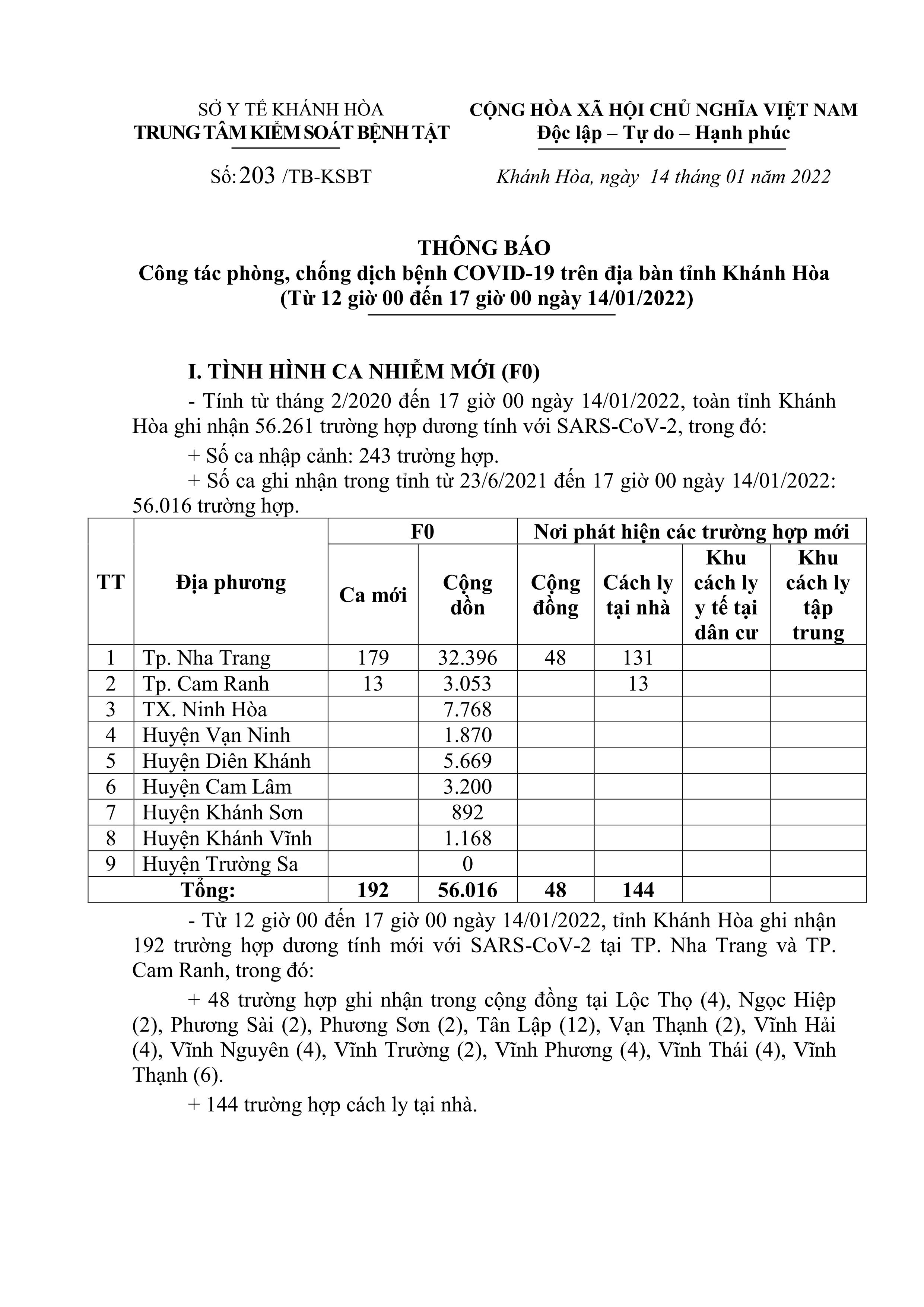 Chiều 14-1, theo Trung tâm Kiểm soát bệnh tật tỉnh Khánh Hòa, từ 12 giờ đến 17 giờ ngày 14-1, toàn tỉnh ghi nhận thêm 192 ca dương tính với SARS-CoV-2.