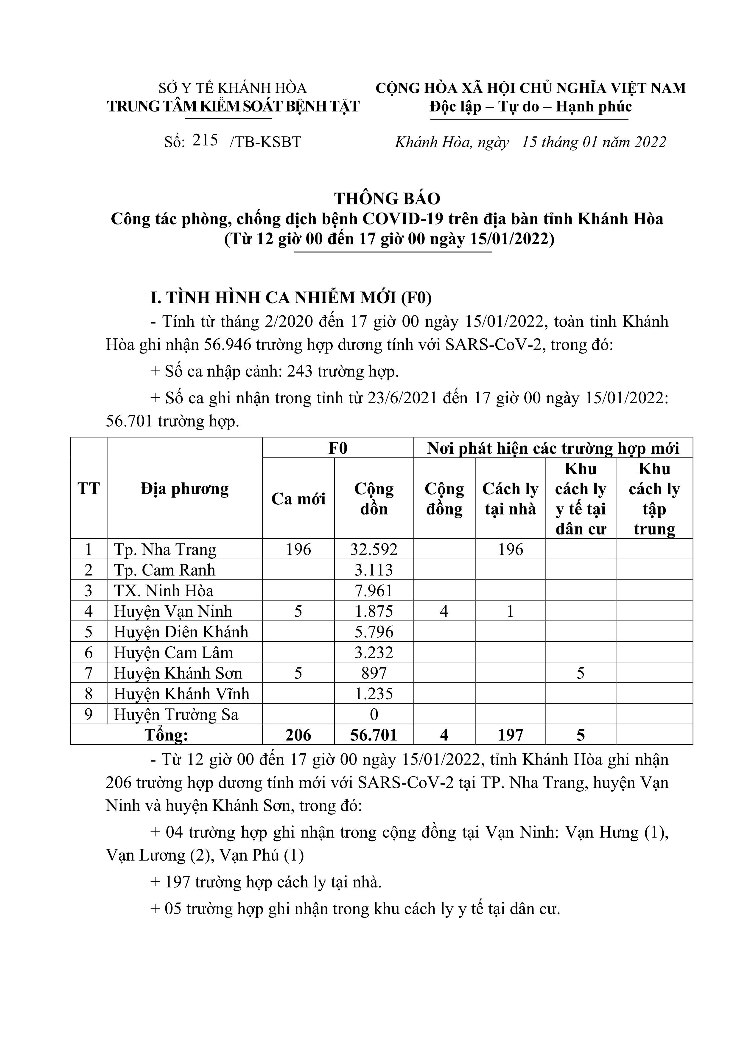 Chiều 15-1, theo Trung tâm Kiểm soát bệnh tật tỉnh Khánh Hòa, từ 12 giờ đến 17 giờ ngày 15-1, toàn tỉnh ghi nhận thêm 206 ca dương tính với SARS-CoV-2.