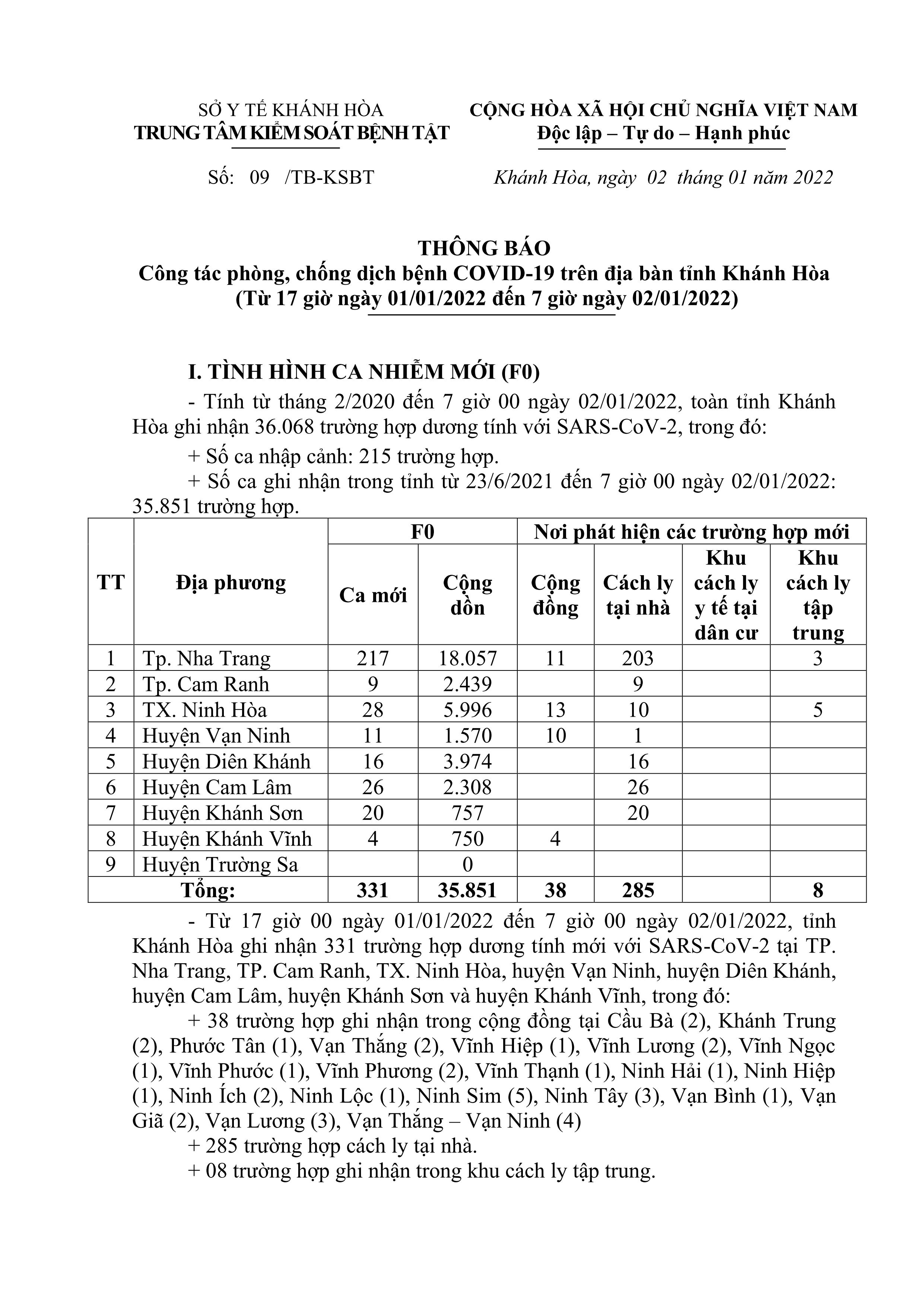 Sáng 2-1, theo Trung tâm Kiểm soát bệnh tật tỉnh Khánh Hòa, từ 17 giờ ngày 1-1 đến 7 giờ ngày 2-1, toàn tỉnh ghi nhận thêm 331 ca dương tính với SARS-CoV-2.