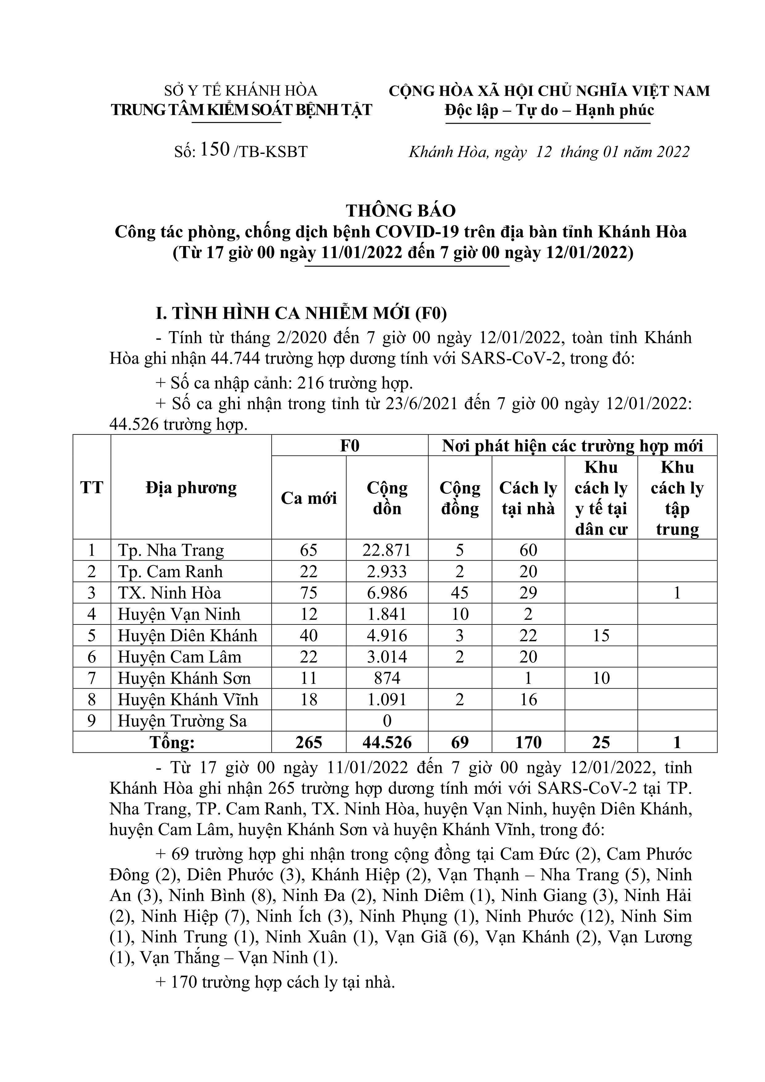 Sáng 12-1, theo Trung tâm Kiểm soát bệnh tật tỉnh Khánh Hòa, từ 17 giờ ngày 11-1 đến 7 giờ ngày 12-1, toàn tỉnh ghi nhận thêm 265 ca dương tính với SARS-CoV-2.