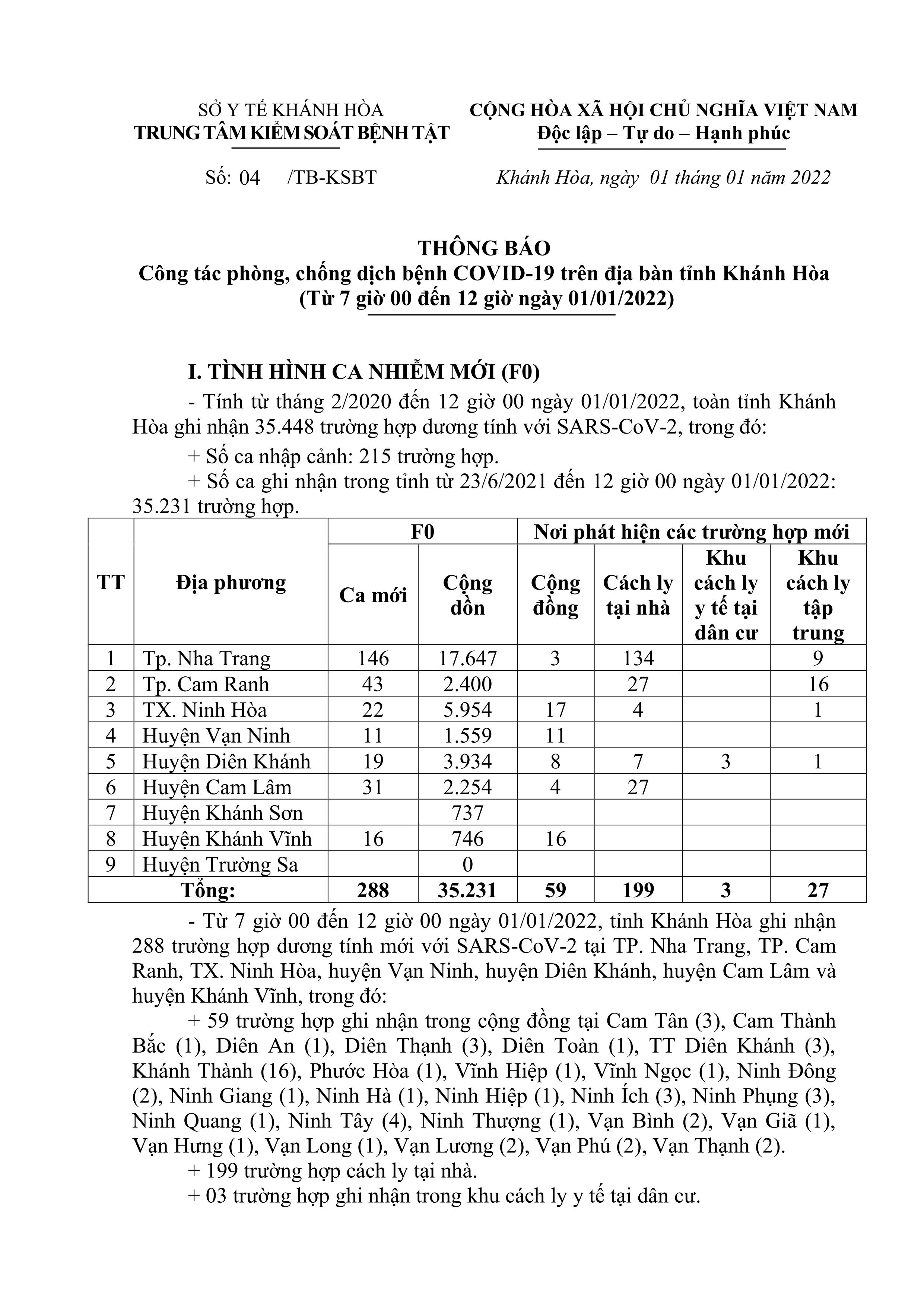 Trưa 1-1-2022, theo Trung tâm Kiểm soát bệnh tật tỉnh Khánh Hòa, từ 7 giờ đến 12 giờ cùng ngày, toàn tỉnh ghi nhận thêm 288 ca dương tính với SARS-CoV-2.