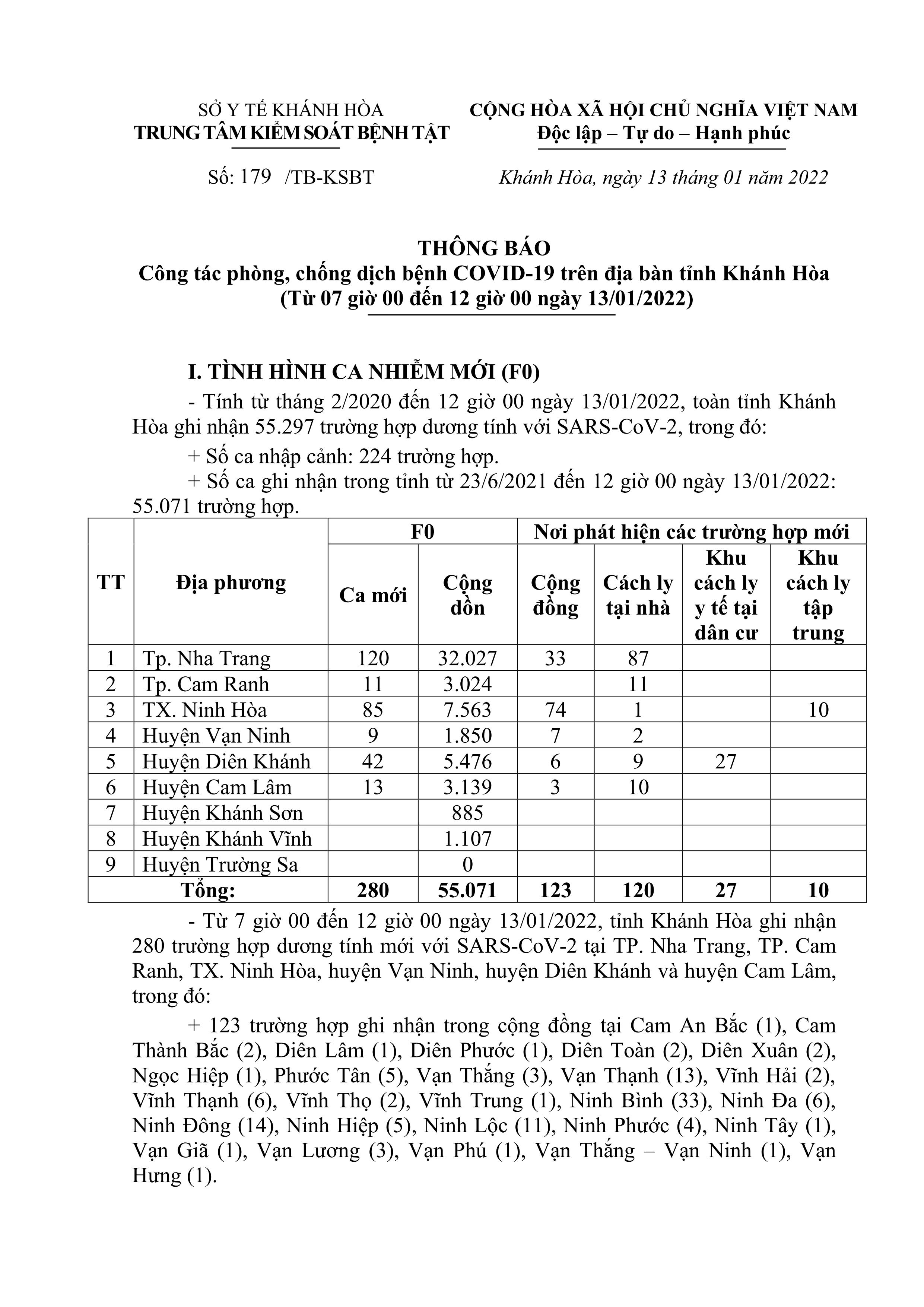 Trưa 13-1, theo Trung tâm Kiểm soát bệnh tật tỉnh Khánh Hòa, từ 7 giờ đến 12 giờ ngày 13-1, toàn tỉnh ghi nhận thêm 280 ca dương tính với SARS-CoV-2.
