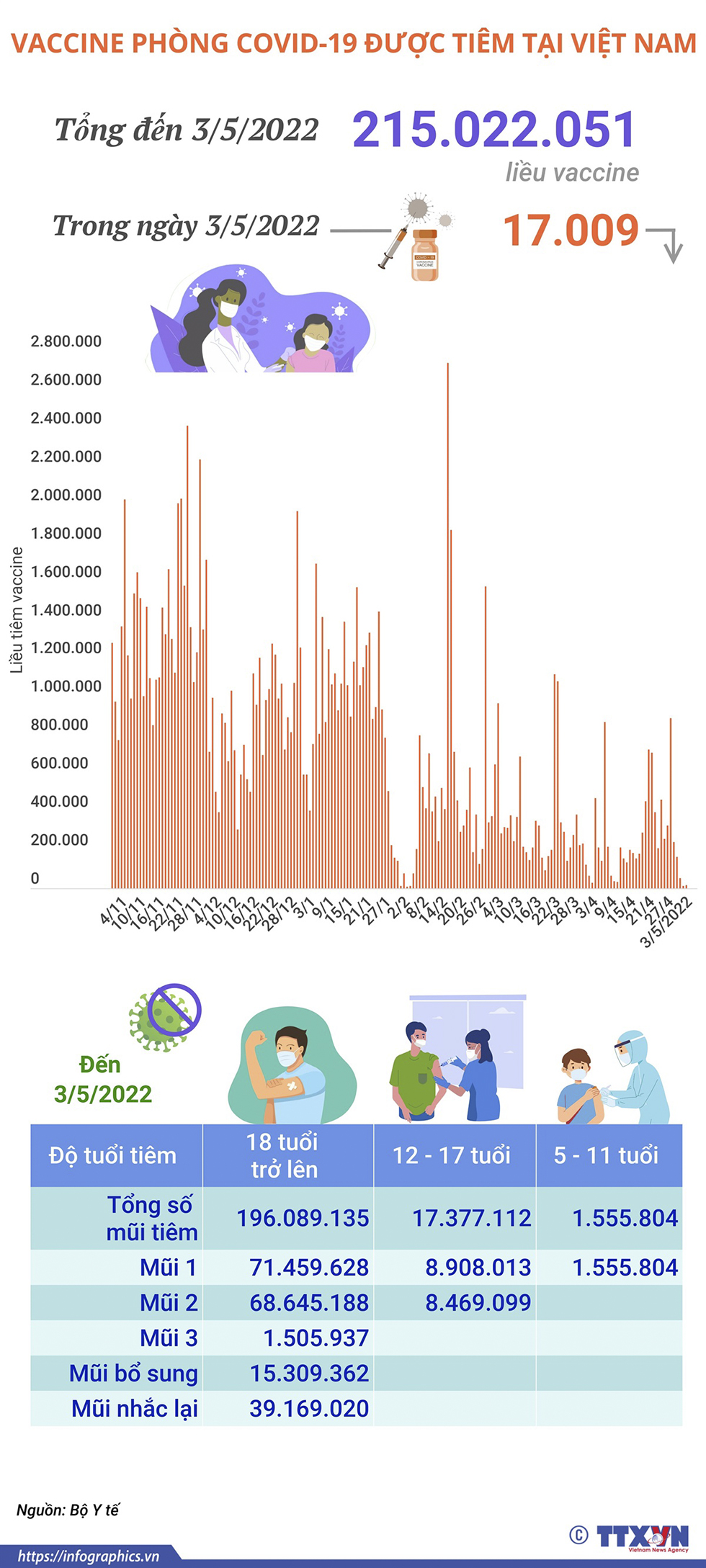 Trong ngày 3/5/2022 có 17.009 liều vaccine phòng COVID-19 được tiêm. Như vậy, tổng số liều vaccine đã được tiêm tại Việt Nam là 215.022.051 liều trong đó tiêm cho người từ 18 tuổi trở lên là 196.089.135 liều, tiêm cho trẻ từ 12-17 tuổi là 17.377.112 liều và tiêm cho trẻ từ 5-11 tuổi là 1.555.804 liều.