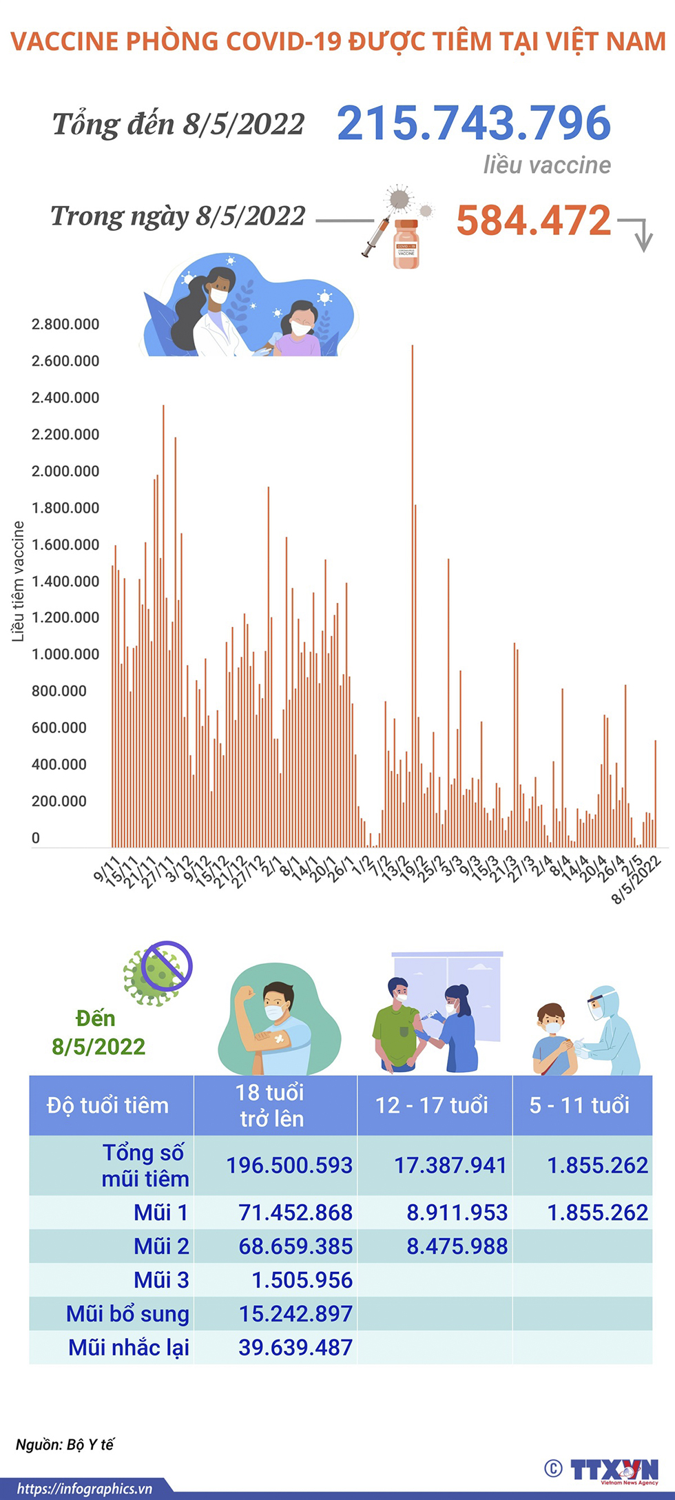 Trong ngày 8/5/2022 có 584.472 liều vaccine phòng COVID-19 được tiêm. Như vậy, tổng số liều vaccine đã được tiêm tại Việt Nam là 215.743.796 liều trong đó tiêm cho người từ 18 tuổi trở lên là 196.500.593 liều, tiêm cho trẻ từ 12-17 tuổi là 17.387.941 liều và tiêm cho trẻ từ 5-11 tuổi là 1.855.262 liều.
