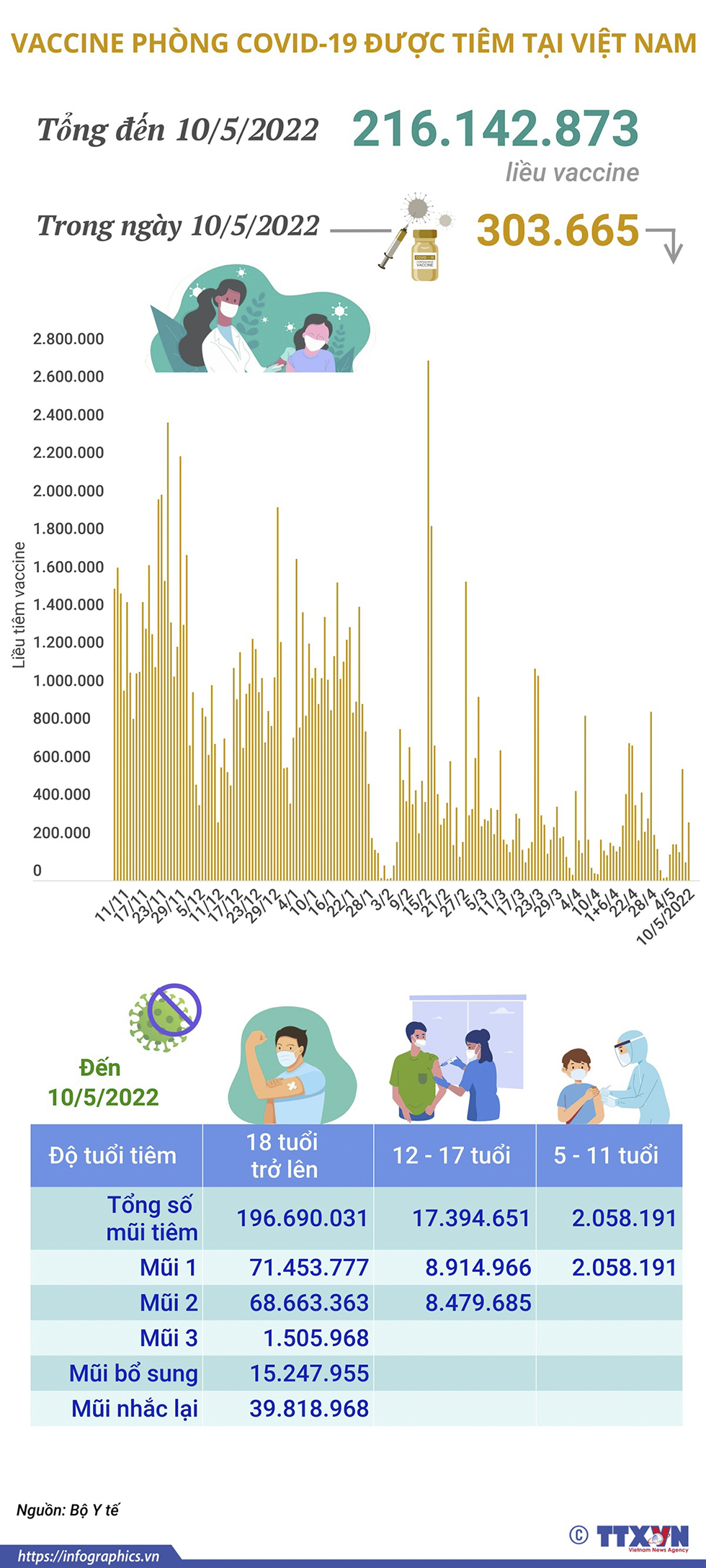 Trong ngày 10/5/2022 có 303.665 liều vaccine phòng COVID-19 được tiêm. Như vậy, tổng số liều vaccine đã được tiêm tại Việt Nam là 216.142.873 liều trong đó tiêm cho người từ 18 tuổi trở lên là 196.690.031 liều, tiêm cho trẻ từ 12-17 tuổi là 17.394.651 liều và tiêm cho trẻ từ 5-11 tuổi là 2.058.191 liều.