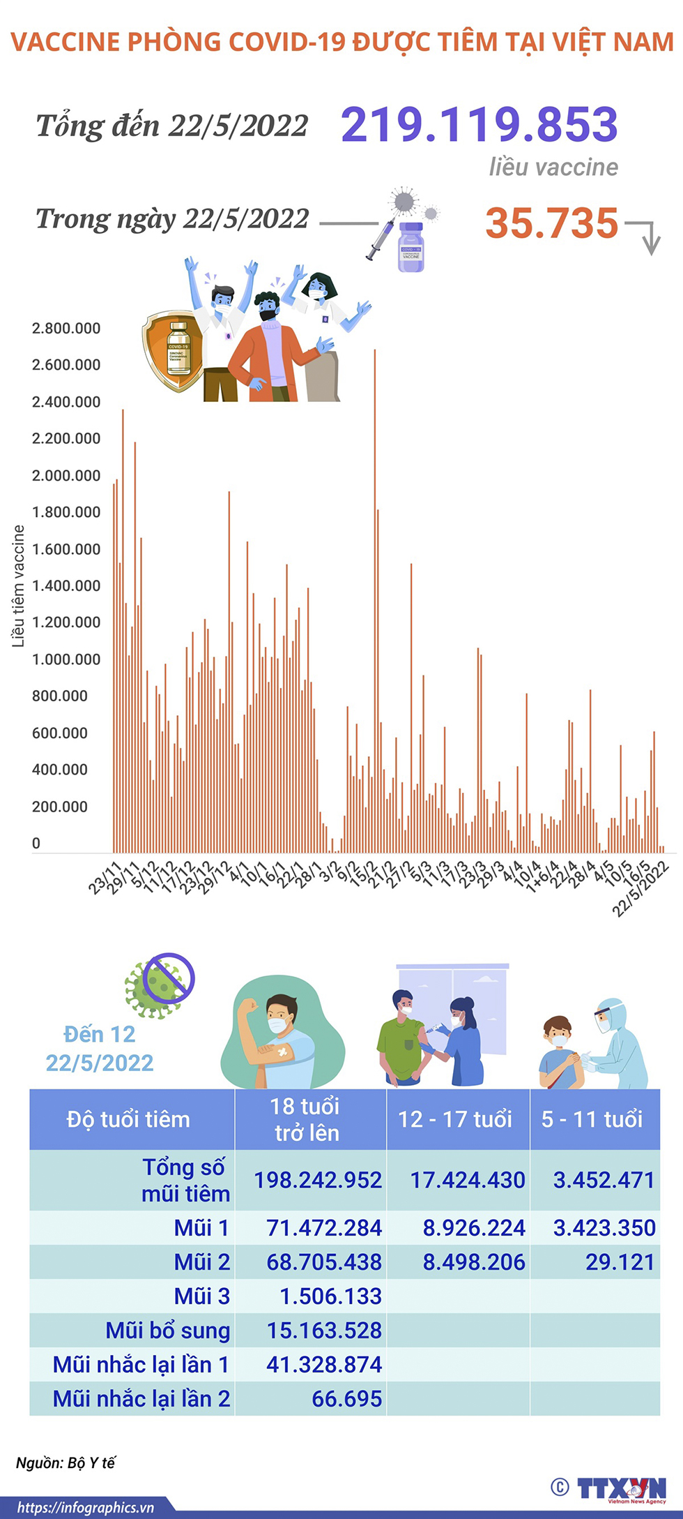 Trong ngày 22/5/2022 có 35.735 liều vaccine phòng COVID-19 được tiêm. Như vậy, tổng số liều vaccine đã được tiêm tại Việt Nam là 219.119.853 liều trong đó tiêm cho người từ 18 tuổi trở lên là 198.242.952 liều, tiêm cho trẻ từ 12-17 tuổi là 17.424.430 liều và tiêm cho trẻ từ 5-11 tuổi là 3.452.471 liều.
