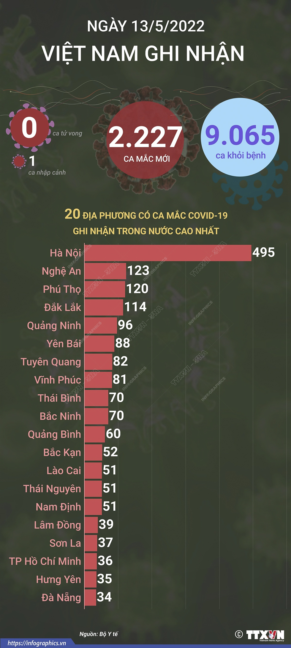 Theo Bộ Y tế, tính từ 16h ngày 12/5 đến 16h ngày 13/5/2022, Việt Nam ghi nhận 2.227 ca mắc mới COVID-19 tại 53 tỉnh, thành phố, 0 ca tử vong do COVID-19, Hà Nội ghi nhận 495 ca, Nghệ An 123 ca, Phú Thọ 120 ca, Đắk Lắk 114 ca, Quảng Ninh 96 ca...