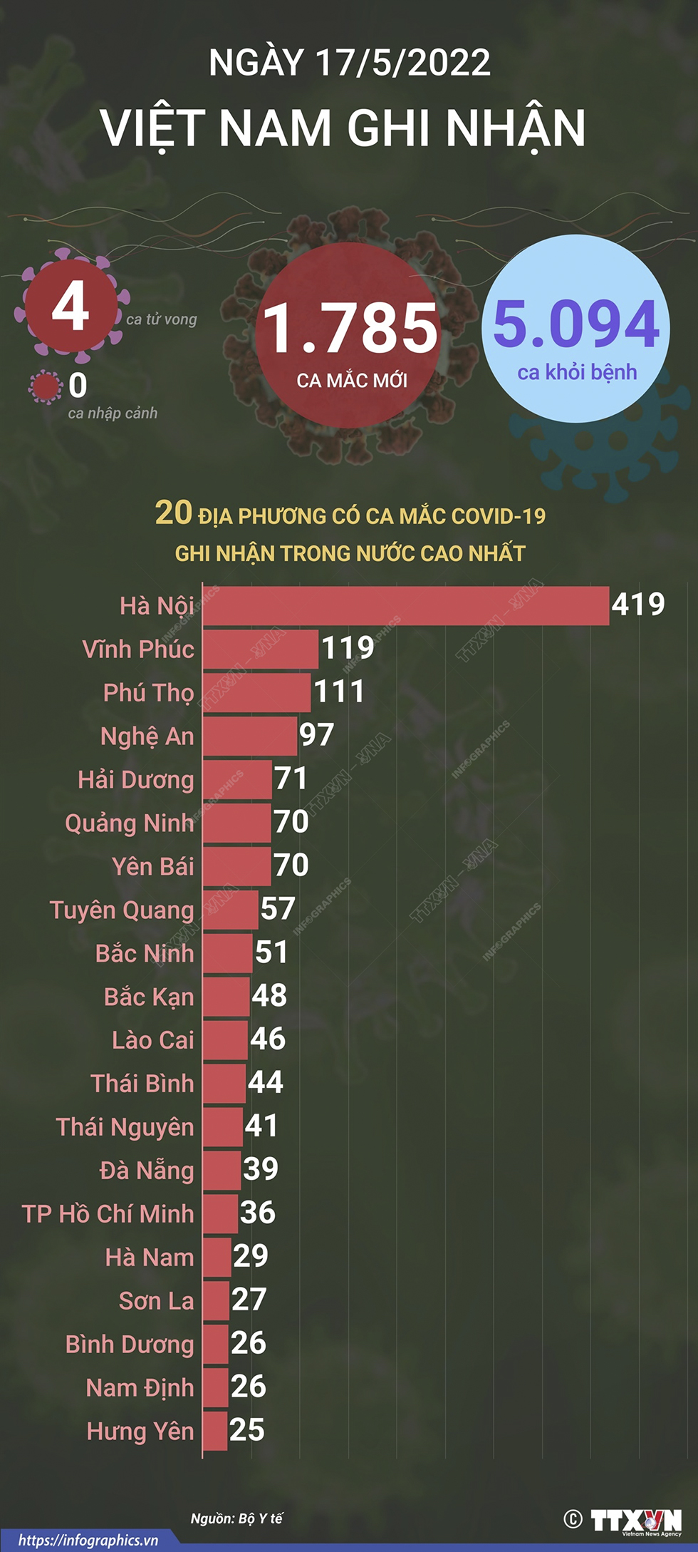 Theo Bộ Y tế, tính từ 16h ngày 16/5 đến 16h ngày 17/5/2022, Việt Nam ghi nhận 1.785 ca mắc mới COVID-19 tại 48 tỉnh, thành phố, 4 ca tử vong do COVID-19, Hà Nội ghi nhận Hà Nội 419 ca, Vĩnh Phúc 119 ca, Phú Thọ 111 ca, Nghệ An 97 ca, Hải Dương 71 ca, Quảng Ninh 70 ca, Yên Bái 70 ca, Tuyên Quang 57 ca, Bắc Ninh 51 ca, Bắc Kạn 48 ca, Lào Cai 46 ca, Thái Bình 44 ca, Thái Nguyên 41 ca, Đà Nẵng 39 ca, TP Hồ Chí Minh 36 ca,… 5.094 ca được công bố khỏi bệnh.
