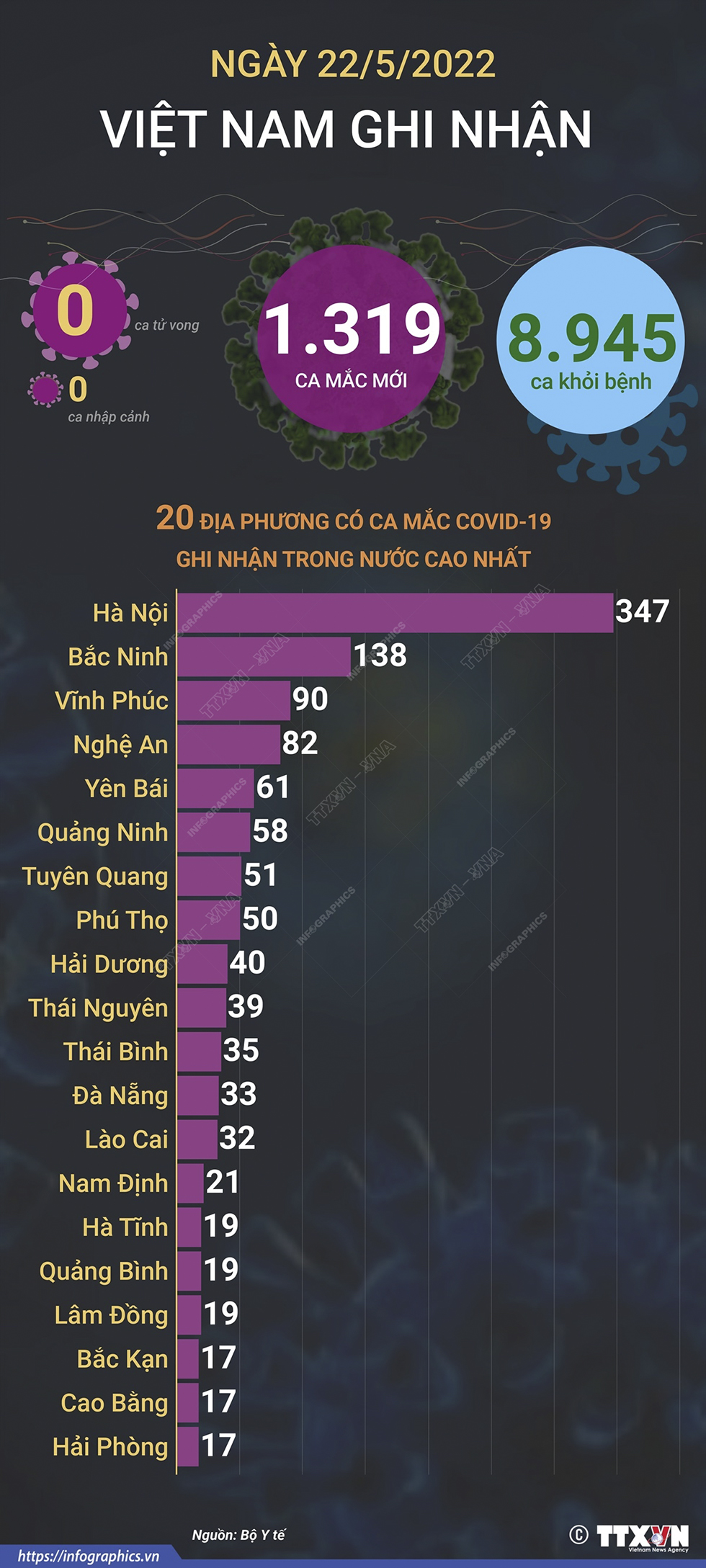 Theo Bộ Y tế, tính từ 16h ngày 21/5 đến 16h ngày 22/5/2022, Việt Nam ghi nhận 1.319 ca mắc mới COVID-19 tại 42 tỉnh, thành phố, 0 ca tử vong do COVID-19. Hà Nội ghi nhận 347 ca, Bắc Ninh 138 ca, Vĩnh Phúc 90 ca, Nghệ An 82 ca, Yên Bái 61 ca