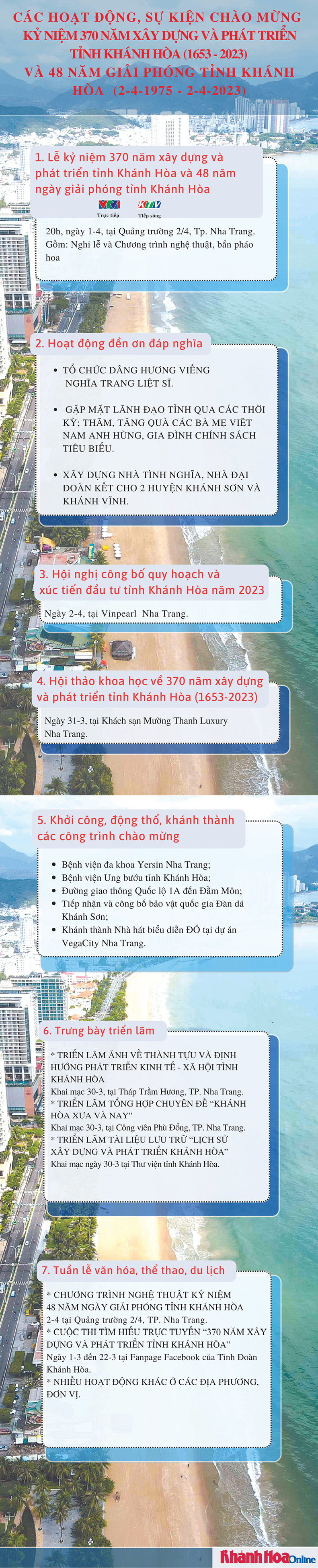 Kỷ niệm 370 năm xây dựng và phát triển tỉnh Khánh Hòa (1653 - 2023) và 48 năm Ngày giải phóng tỉnh Khánh Hòa (2-4-1975 - 2-4-2023), tỉnh Khánh Hòa sẽ tổ chức nhiều hoạt đông, sự kiện...