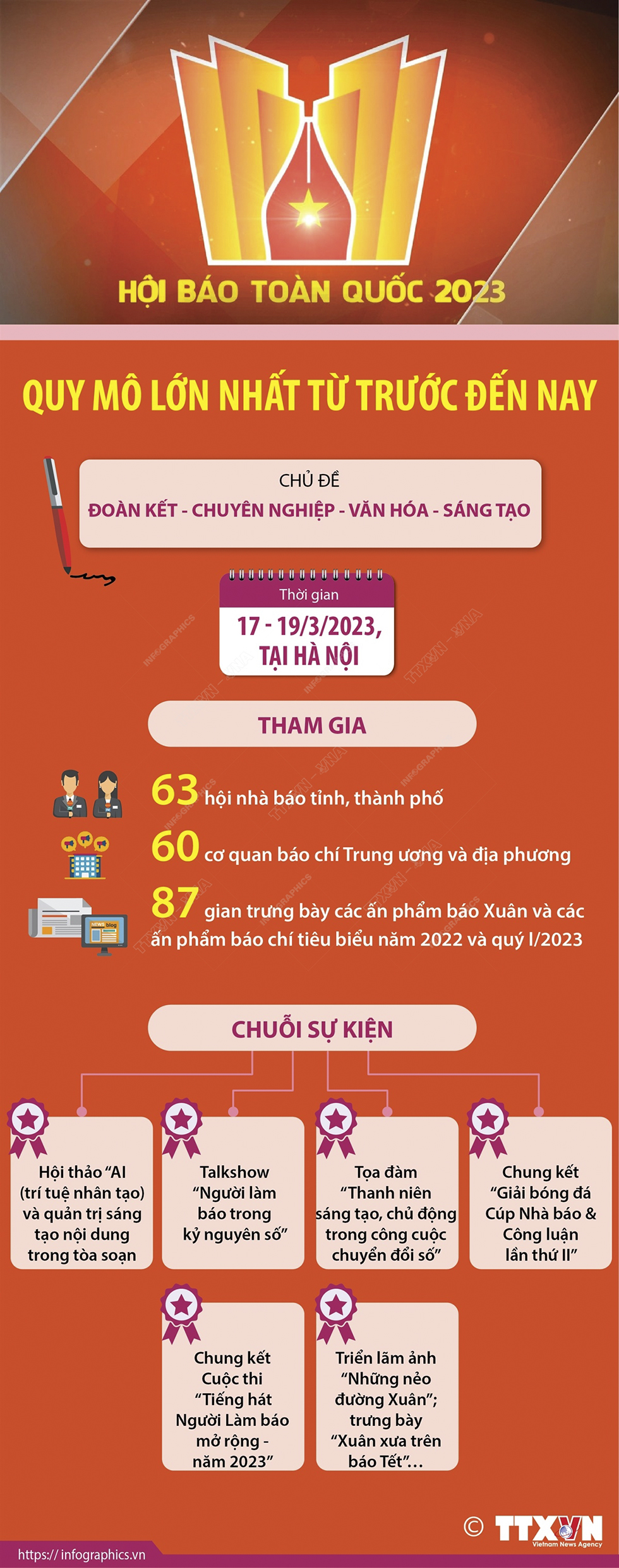 Với chủ đề “Đoàn kết - Chuyên nghiệp - Văn hóa - Sáng tạo”, Hội Báo toàn quốc năm 2023 diễn ra trong 3 ngày từ 17 đến 19/3/2023 tại Bảo tàng Hà Nội. Hội Báo toàn quốc năm 2023 được tổ chức với quy mô lớn nhất từ trước đến nay với sự góp mặt của 63 hội nhà báo tỉnh, thành phố, 60 cơ quan báo chí Trung ương và địa phương cùng các gian trưng bày chuyên đề tiêu biểu của các Liên Chi hội. Hội Báo toàn quốc là ngày hội lớn vào dịp đầu xuân của những người làm báo trong cả nước.