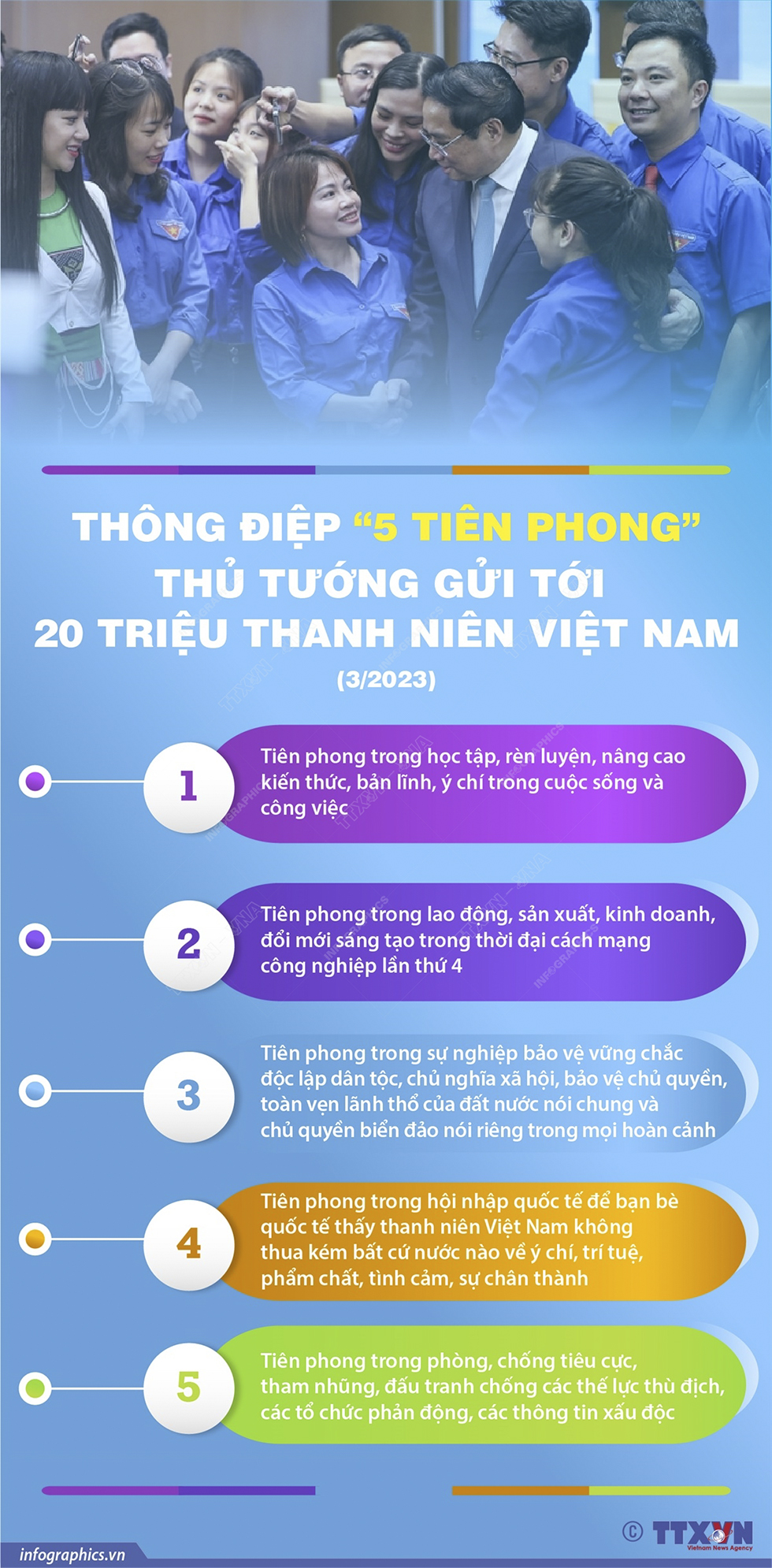 Đối thoại với thanh niên Việt Nam năm 2023, Thủ tướng Chính phủ Phạm Minh Chính đã gửi thông điệp “5 tiên phong” tới hơn 20 triệu thanh niên Việt Nam cả ở trong nước và đang học tập, làm việc, sinh sống ở nước ngoài, Thủ tướng khẳng định Đảng và Nhà nước ta luôn luôn coi trọng và đánh giá rất cao vai trò, vị trí, tầm quan trọng của thanh niên với sự nghiệp xây dựng và bảo vệ Tổ quốc.