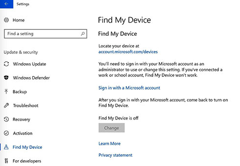 Nếu chưa đăng nhập bằng tài khoản Microsoft, bạn chỉ cần nhấp vào tùy chọn Sign in with a Microsoft account và làm theo các bước hướng dẫn, ngược lại, bạn có thể bỏ qua bước này. Sau đó, bấm Change và kích hoạt tính năng Find My Device.