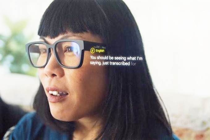 Thiết bị có vẻ bề ngoài giống như một cặp kính thông thường, hiển thị các cuộc trò chuyện liên quan đến tiếng Anh, tiếng Trung, tiếng Tây Ban Nha và ngôn ngữ ký hiệu Mỹ.