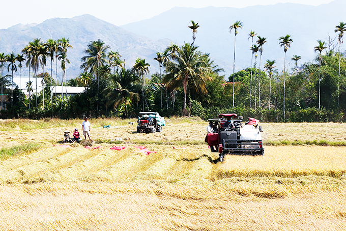 Nông dân xã Diên Hòa, huyện Diên Khánh thu hoạch lúa đông xuân. |