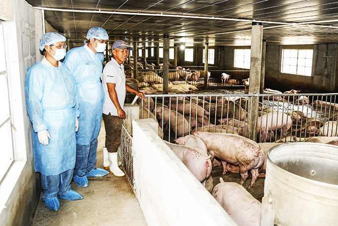 Cơ quan thú y kiểm tra công tác phòng dịch trên đàn heo của 1 hộ nuôi ở Cam Lâm. |