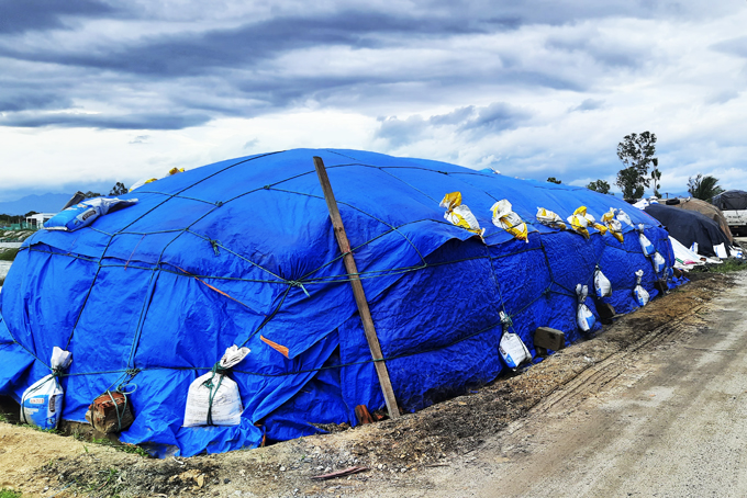 Muối ứ đọng được chất đống, phủ bạt trên cánh đồng muối phường Ninh Diêm. |