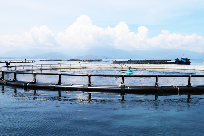 Những lồng nuôi cá chẽm của Công ty TNHH Thủy sản Australis Việt Nam trên vịnh Vân Phong. |