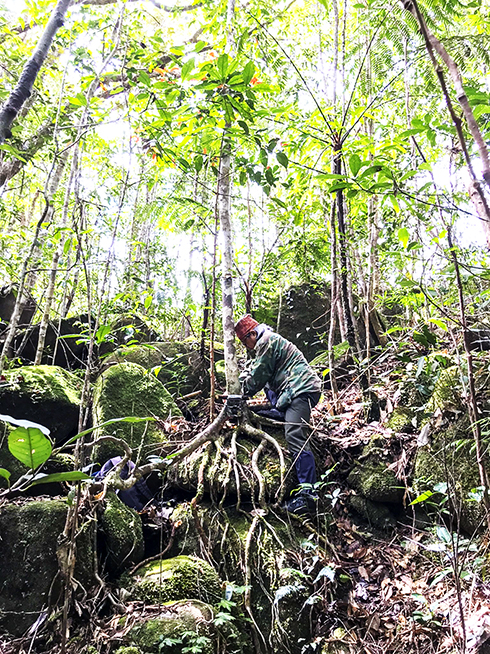 Ông Lưu Văn Nông kiểm tra bẫy ảnh, thu thập dữ liệu động vật hoang dã trong Khu Bảo tồn thiên nhiên Hòn Bà. (Ảnh do đơn vị cung cấp) |