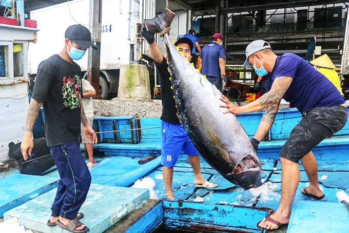Ngư dân cập cảng, lên cá tại cảng Hòn Rớ. |