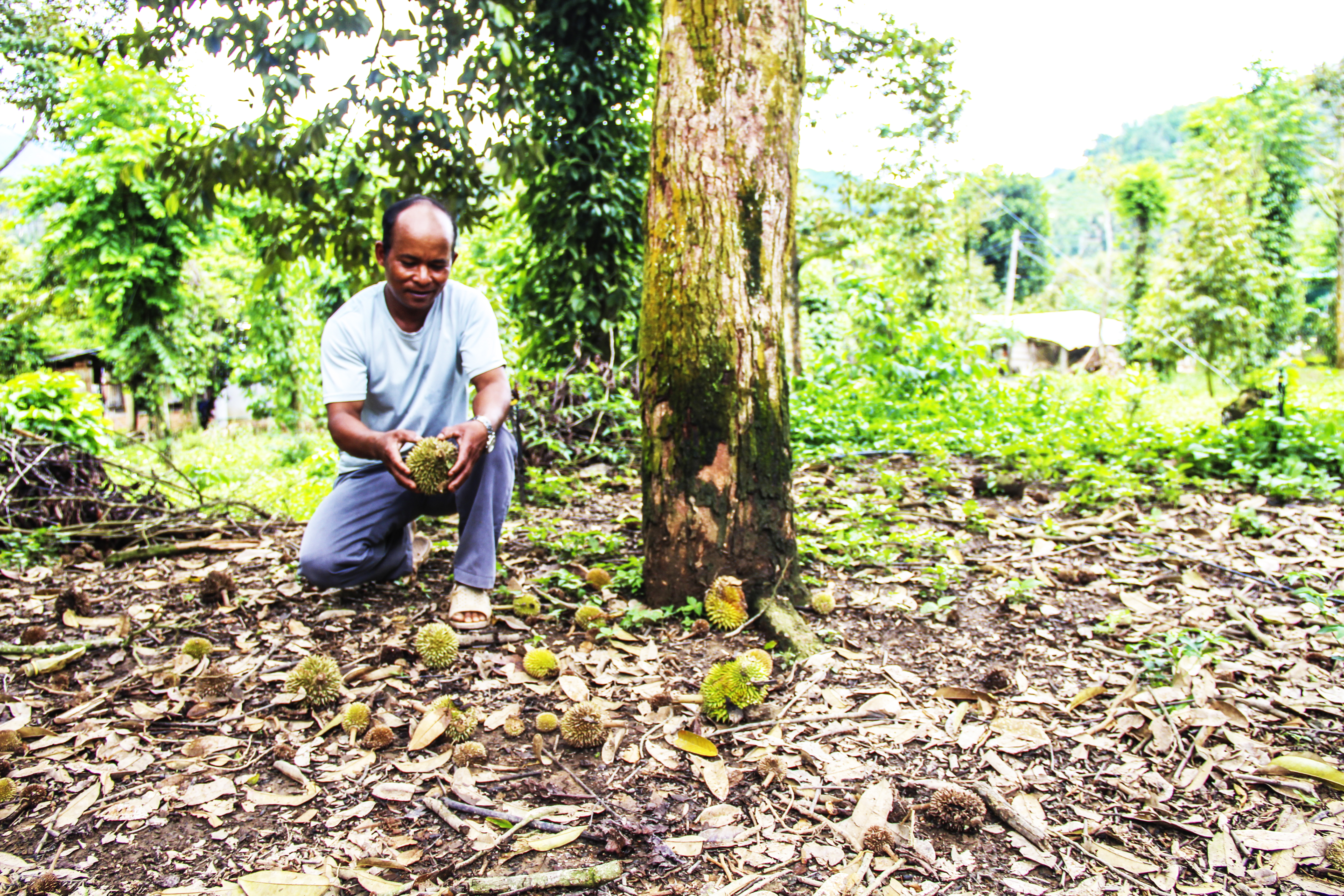 Vườn sầu riêng của gia đình ông Bo Bo Khá bị rụng nhiều trái non. |