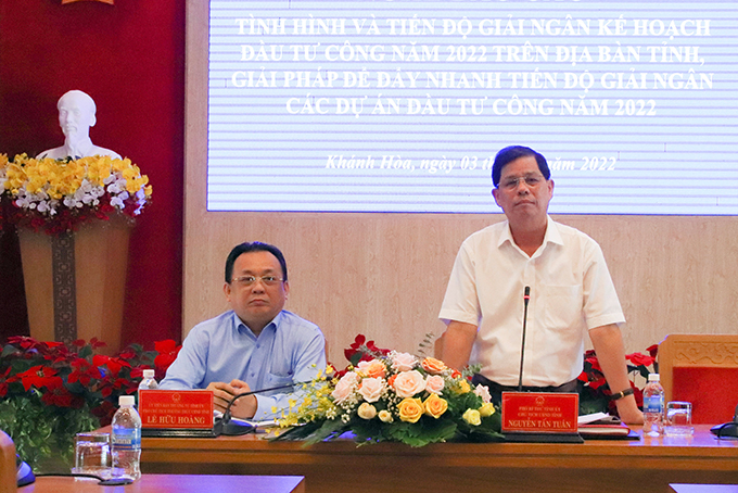 Sáng 3-6, các ông: Nguyễn Tấn Tuân - Phó Bí thư Tỉnh ủy, Chủ tịch UBND tỉnh Khánh Hòa; Lê Hữu Hoàng - Phó Chủ tịch Thường trực UBND tỉnh chủ trì hội nghị nghe báo cáo tiến độ giải ngân kế hoạch đầu tư công năm 2022 trên địa bàn tỉnh.