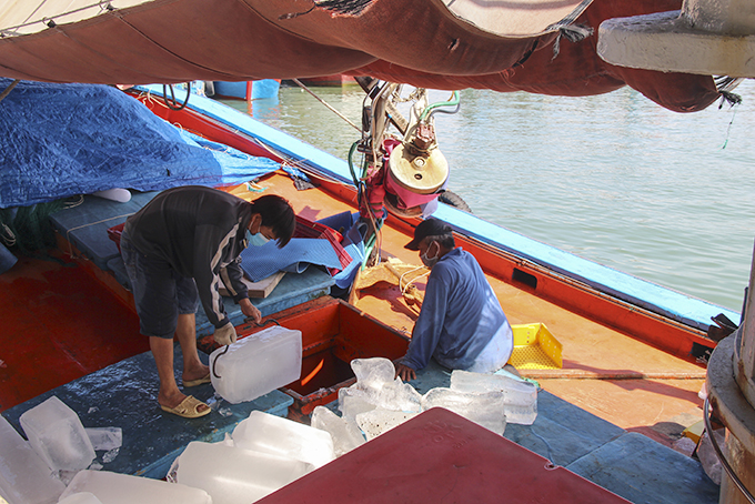 Tàu cá của ngư dân cập cảng Hòn Rớ tiếp đá lạnh, chuẩn bị vươn khơi. |