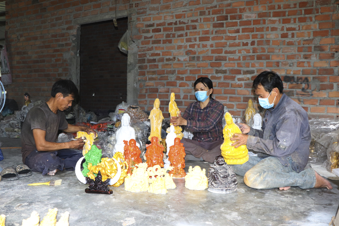 Do ảnh hưởng của dịch Covid-19 nên 2 năm gần đây, cơ sở đúc tượng mỹ nghệ bằng đá của ông Nguyễn Đình Trọng (thôn Đảnh Thạnh) gặp khó khăn trong tiêu thụ sản phẩm. “Trước đây, sản phẩm mỹ nghệ bằng đá của cơ sở chủ yếu phục vụ khách du lịch, đặc biệt là khách Nga. Từ khi dịch xảy ra, khách du lịch giảm nên tôi phải tìm hiểu các thị trường khác, thay đổi mẫu mã sản phẩm để duy trì hoạt động”, ông Trọng nói. Hiện nay, mỗi ngày, cơ sở có 6 lao động làm việc với mức lương 5 triệu đồng/người/tháng. Doanh thu mỗi tháng đạt 300 triệu đồng.