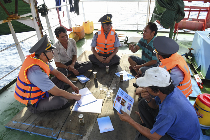 Ông Nguyễn Minh Lành - Chi đội trưởng Chi đội Kiểm ngư số 4 cho biết, thời gian qua, lãnh đạo chi đội thường xuyên chỉ đạo các tàu của đơn vị tăng cường tuần tra, kiểm soát, nắm chắc tình hình hoạt động của các tàu cá trong khu vực được phân công phụ trách; kiểm tra, nhắc nhở ngư dân lắp đặt, vận hành thiết bị giám sát hành trình trên tàu cá; ghi, nộp nhật ký khai thác thủy sản đầy đủ theo quy định; không sử dụng xung điện, vật liệu nổ để khai thác thủy sản... Lực lượng của đơn vị đã trực tiếp đến từng tàu cá của ngư dân để tuyên truyền. Từ đầu năm đến nay, chi đội đã thực hiện tuyên truyền trên biển cho 3.335 lượt ngư dân; cấp phát hơn 2.000 cuốn sổ tay hỏi - đáp pháp luật về kiểm ngư và sổ tay Luật Biển Việt Nam, hơn 2.000 tờ rơi, tờ gấp tuyên truyền...