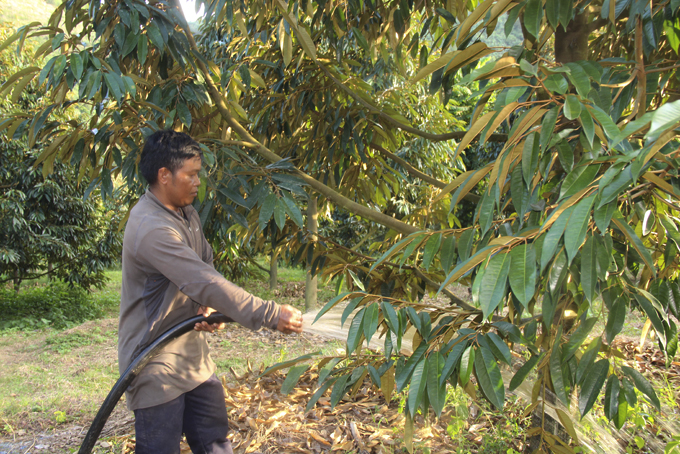 Người dân xã Sơn Hiệp chăm sóc cây sầu riêng. |