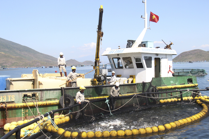 Nuôi biển bằng công nghệ lồng nuôi HDPE trên vịnh Vân Phong. Ảnh: B.L |