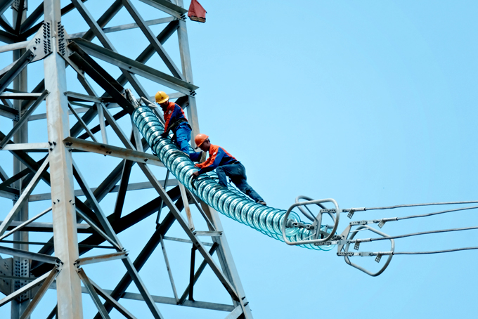 Hoàn thành lắp sứ cho đường dây 500kV Vân Phong. Ảnh: VĨNH TÂN |