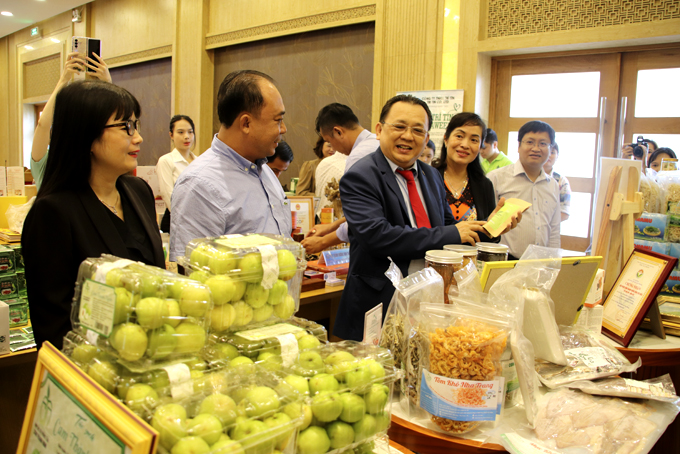 Lãnh đạo tỉnh tham quan các sản phẩm giới thiệu tại hội nghị. |