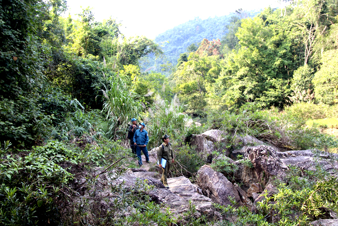Lực lượng bảo vệ rừng của Công ty Lâm nghiệp Trầm Hương tuần tra, bảo vệ rừng thượng nguồn sông Chò. Ảnh: THIỆN TÂM |