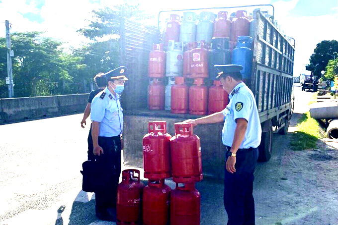 Lực lượng quản lý thị trường kiểm tra đột xuất phương tiện vận chuyển gas vi phạm. |