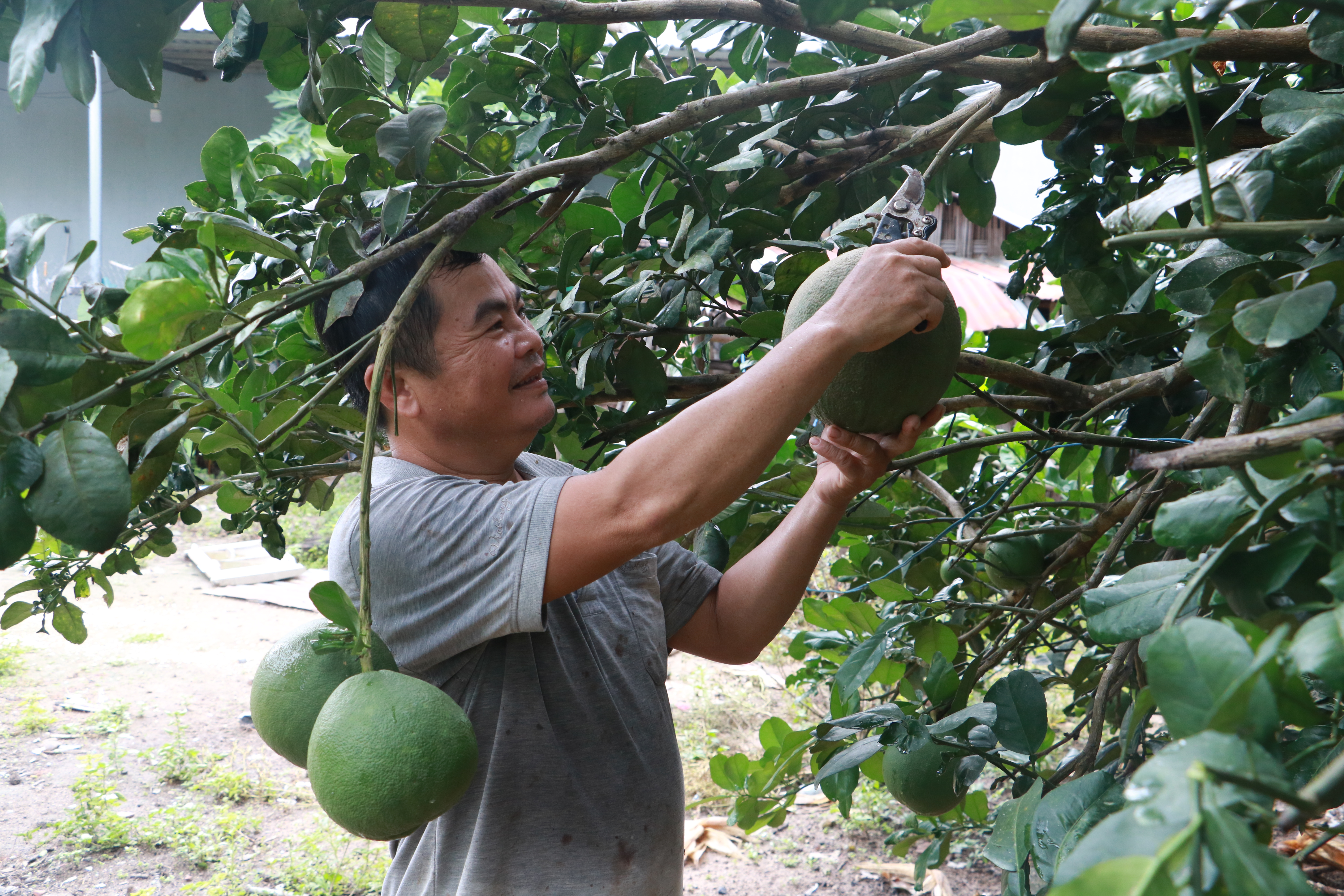 | Ông Bành Tạ Long chăm sóc vườn bưởi của gia đình. |