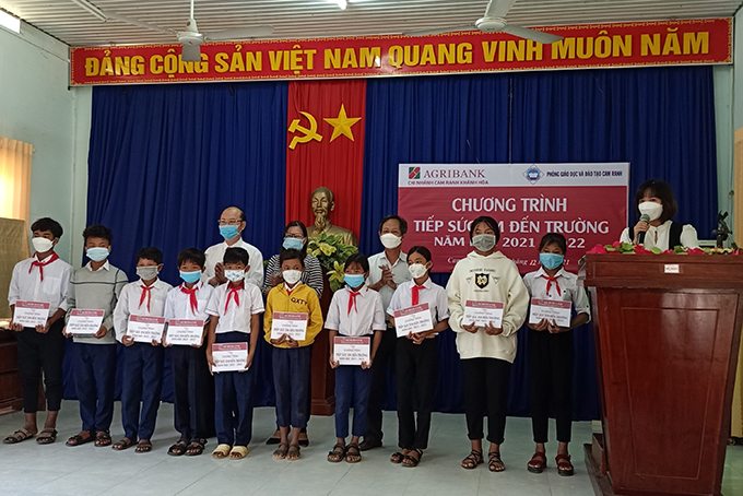 Thực hiện chương trình an sinh xã hội năm 2021 với chủ đề “Tiếp sức em đến trường”, sáng 7-12, tại Trường THCS Nguyễn Du, xã Cam Phước Đông, TP. Cam Ranh, Agribank Chi nhánh TP. Cam Ranh phối hợp với Phòng Giáo dục và Đào tạo thành phố tổ chức trao tặng học bổng cho học sinh nghèo vượt khó trên địa bàn.