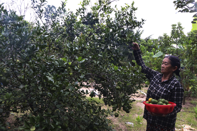 Bà Nguyễn Thị Tùng thu hoạch trái cây trong vườn. |