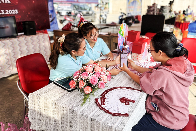 Khách hàng đến trải nghiệm dịch vụ tại gian hàng Agribank Chi nhánh huyện Vạn Ninh. |