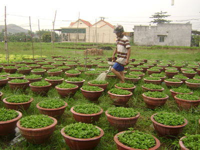 Khoảng hơn một tháng rưỡi trở lại đây, làng trồng hoa ở phường Ninh Giang nhộn nhịp hẳn lên khi nhà nhà bắt đầu xuống giống trồng hoa Tết. Dọc 2 bên đường chạy qua các tổ dân phố Phong Phú 1, Phong Phú 2, Phú Thứ... của phường, thay cho các khu đất trống giờ là hàng ngàn chậu cúc pha lê, cúc đại đóa cao khoảng một lóng tay đang thời kỳ trổ lá.