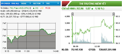 * Tại sàn TP Hồ Chí Minh, chỉ số VN-Index đóng cửa tăng 1,81 điểm (+0,24%) và lên mức 742,74 điểm. Thanh khoản đạt hơn 225,25 triệu đơn vị, tương ứng giá trị giao dịch đạt 5.133,93 tỷ đồng. Toàn sàn có 141 mã tăng, 42 mã đứng giá và 126 mã giảm giá.