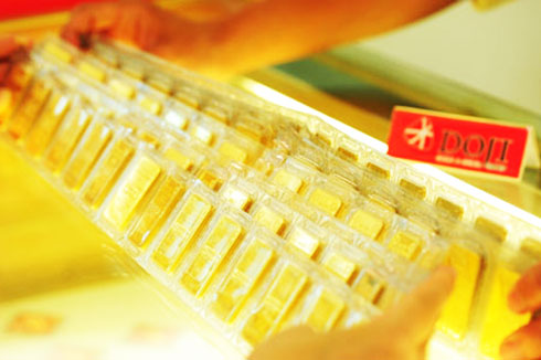 Giá vàng thế giới ở cùng thời điểm thấp hơn giá vàng trong nước, giá quy đổi 34,49 đồng/lượng.