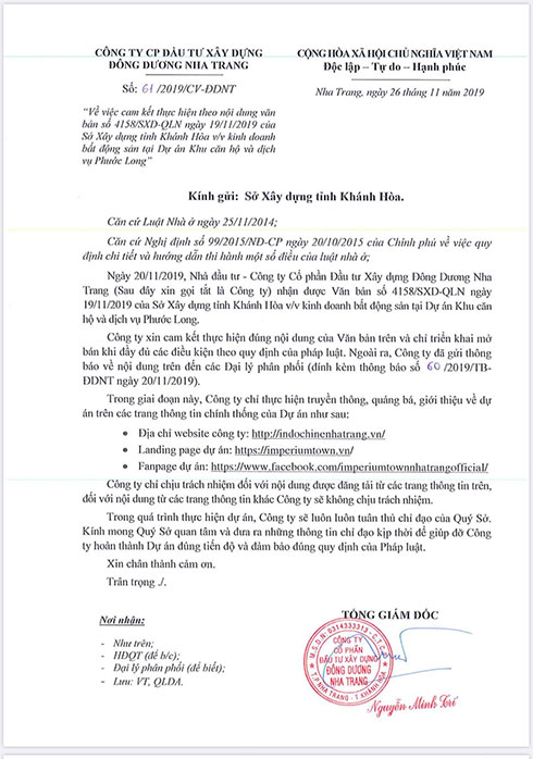 Theo đó, chủ đầu tư cam kết thực hiện đúng nội dung Sở Xây dựng yêu cầu, sẽ chỉ triển khai mở bán khi đầy đủ các điều kiện theo quy định của pháp luật. Trong giai đoạn này, công ty chỉ thực hiện truyền thông, quảng bá, giới thiệu về dự án trên các trang thông tin chính thống của dự án (http://indochinenhatrang.vn; landing page http://imperiumtown.vn và fanpage http://www.facebook/imperiumtownnhatrangoffical/ ). Công ty chỉ chịu trách nhiệm đối với nội dung được đăng tải từ các trang thông tin trên, đối với nội dung từ các trang thông tin khác công ty không chịu trách nhiệm.