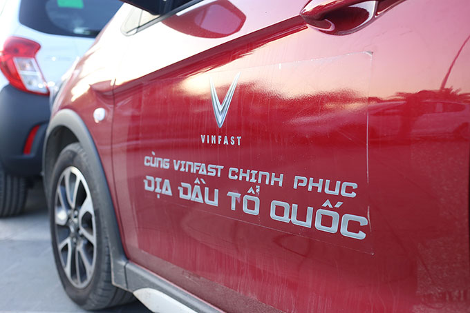 Trước khi lên đường, xe trong đoàn đều dán logo với dòng chữ "Cùng VinFast chinh phục địa đầu Tổ quốc".