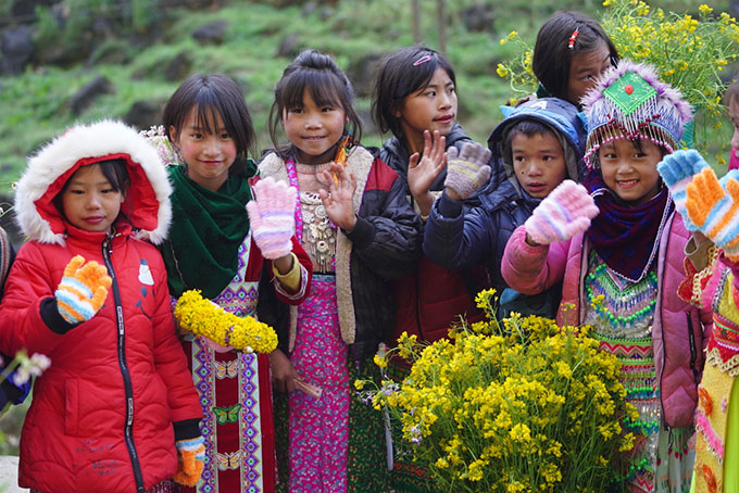 Điểm xuyết trong hành trình qua miền đá là hình ảnh nụ cười hồn nhiên của những em bé vùng cao. Suốt quãng đường gần 200 cây số từ thành phố Hà Giang lên đèo Mã Pì Lèng, “đoàn xe Quốc kỳ” được rất nhiều em nhỏ vẫy chào.